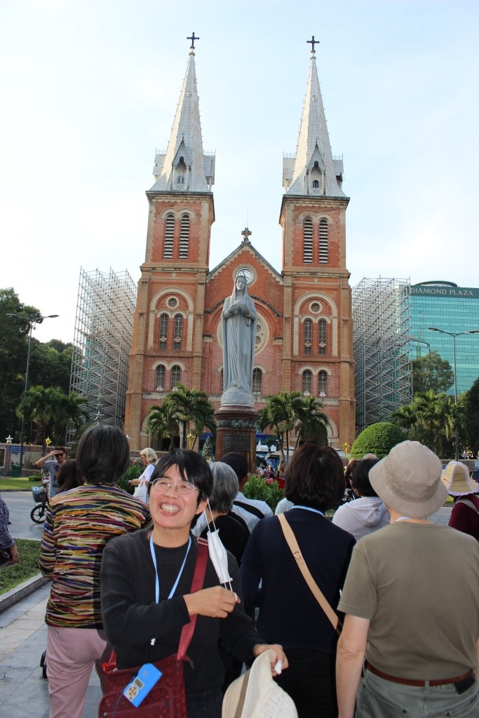 ホーチミンまで行き6時間、帰りは4時間行きの空路は約6時間。機内では、昼食と飲み物のサービスがある。 私は、映画(アニメ)「君の名は」と「花戦さ」という邦画を見て過ごした。確かに「君の名は」物語として空想的だが、感動するものがあった。 「君の名は」は、1000年ぶりとなる彗星がくるのを1カ月後に控えた日本を舞台に、山深い田舎町に暮らす女子高生・三葉と東京で暮らす男子高生の瀧が入れ替わってしまうというストーリー。だが、すでに三葉は、彗星の落下で死んでいたのだ。ラストで二人が出会うシーンは感動になる。2016年8月に公開され、累計の興行収入は250億円を突破し、邦画歴代2位の記録となっているアニメ。アニメなので、映像として映画館で見るのがより感動すると思う。 「花戦さ」は、僧・池坊専好(野村萬斎)が華道、生け花で秀吉(市川猿之助)とたたかって勝った話である。対照的に茶道で秀吉と対峙した利休は切腹させられてしまったことが描かれている。歴史ものとして豪華キャストで面白い。 現地時間の13時半にホーチミンの空港に着く。日本との時差は2時間である。以後、現地時間で表示する。ホーチミンの天気は晴れ。気温30度。日本では真夏といったところだが、蒸し暑くはなく30度もあるとは感じない。いまベトナムは乾季で湿度は少ないのが原因か。むしろ日本の初夏のようだ。日本が冬だったので、長袖から半袖に着替える。 入国手続きを経て、現地ガイドに案内されホーチミン市内観光に向かう。ガイドの最初の挨拶は、xin chao シンチャオ「こんにちは」である。今回は、日本からの添乗員も一人ついていた。よく聞けば、添乗員は、阪急交通社の社員ではなく子会社からの派遣という。派遣は日本社会の隅々まで広がっているなと思う。労働者派遣法の改悪で派遣できる職種が広がったことで、低賃金労働者が加速度的に広がり、日本の貧困と格差を広げていて、深刻な問題である。 今回のツアーの移動は、貸し切りバスである。ベトナムには地下鉄がなく、交通機関は、バス、タクシーである。市内バスは、観光客には乗りこなすのが難しい。 最初は、旧南ベトナム大統領官邸で今は統一会堂といわれ博物館になっている場所。1975年4月30日、人民解放軍の戦車がここに突入し、ベトナム戦争が終わった。当時、この建物からヘリで逃げる人々が日本のテレビでも写し出されていたことを思い出す。すぐ近くには、19世紀末に建てられた赤レンガ造りのサイゴン大教会がある。表の二つの尖塔が美しい。今、修復工事中で中に入れない。