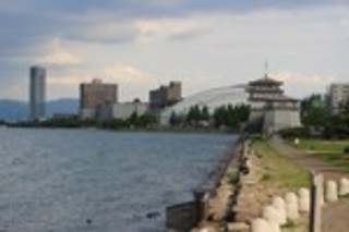 駅前から歩いて、少し下り、琵琶湖畔を目指す。まっすぐ歩いて20分くらいで、湖畔に着く。ここが、琵琶湖最南端で一番すぼんだところだ。地図を見ればわかるが、大津から北に向かって大きく広がっている。湖というより海に近く、大津港には、大きな船や監視船もある。 大津港から駅の方向に少し戻ると、今日の宿のホテルがある。屋上の東横インという看板が遠くからも見えるのでわかる。 大津の街を歩いたが、店が少ない。特に、飲食店が少ないような気がした。 ホテルにつき、シャワーを浴びて、6時半頃、夕食に外に出る。外は、夕立が来たようで道路がぬれている。 ホテルの傘を借りて、暗くなった大津の街を歩く。アーケード街があるが、開いている飲食店は一、二軒。そこを通り過ぎて、駅に向かって歩く。駅前に行けば店があるだろうと思い歩く。雨はポツリポツリ。 明るくなってきた。駅前の灯りである。駅前のホテルの一階に、この地発祥の「近江ちゃんぽん」屋や焼き肉店などがあった。その反対側には、飲み屋などがあった。ふと目にすると、すし屋が目に留まったので、そこにすることにする。中は、飲み屋スタイル。19時頃になっていたので、すでに客は8割くらい入っていた。 19時までは、飲み物半額であった。握り・巻物寿司と手羽先揚げなどのつまみを頼む。妻は、お茶である。いつも、飲まないが食べる。 私は、ビールを飲んでハイボールを頼む、さいころを振ってその目がぞろ目だとただになる。軽く振ると六のぞろ目、一杯ただとなった。面白い店である。 1時間半くらい居て、二人で約4000円。また、ホテルに向かって歩いていく。来た道と違うが、飲食店の灯りがちらほらとある。 ホテルには、9時頃ついた。妻は、風呂にはいる。私は、すでにシャワーを浴びていたので、10時頃には寝入った。 翌日、6時頃に起床。外は晴れ。暑くなりそう。 7時にホテルの1階で朝食。ごはん、みそ汁、パン、煮物、ポテサラ、葉物サラダなど。ビジネスホテルの朝食であった。連休とあって、カップルや、中高年の夫婦連れ、外国の旅行者が多い。 実は、今回は、観光が目的ではない。京都の買いたい不動産を見に来たのである。