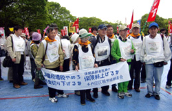 東日本大震災の被災地の一日も早い復興、原発事故の放射能除染や損害賠償などでの政府と東京電力の責任ある対応を要求し、野田内閣が「命をかけて」と公言する「社会保障と税の一体改革」、大飯原発の再稼働、TPPへの交渉参加などの暴走を許さないために、たたかいを発展させる決意を固めあいました。また、「貧困と格差の解消、安定した雇用と社会保障の拡充をはかれの運動を強め、日本の社会経済の閉塞(へいそく)感を打ち破り、成長が止まった日本経済を立て直すために、労働運動が社会的役割を発揮できるよう奮闘しよう」と決意しあいました。そして、約3.7キロを新宿まで元気よく、シュプレヒコールを行いながら、デモ行進をしました。